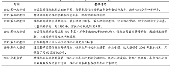 從1979年10月中國國際信托投資公司成立開始,中國信托業走過了30 多年的歷程。信托業務早期更像是多元投資的“雜貨鋪”,由于投資種類 多和風險偏好高,信托機構多次出現投資失誤和壞賬危機,故被稱為 金融機構的“壞孩子”。中國信托業歷史上經歷了六次整頓,在此過程中 行業洗牌,格局重塑,牌照目前不足 70 家。