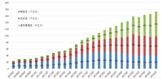 從使用功能看,融資類占比下降,而主動型的信托業務占比提升。 2010 年第一季度到 2013 年第四季度,信托行業融資類業務長期占據 “半壁江山”(49%以上),但自 2014 年第一季度以來該類業務占比進入 下降趨勢,一度滑落至 2016 年第二季度的 23.68%;與之相對的是,事 務管理類信托規模增速顯著,該類業務占比從 2012 年第一季度的 12.50%提升至2016年第二季度的 43.20%;同時投資類信托規模占比近 年來相對穩定,自 2011 年第二季度超過 30%以來,一直在 33%~39%之 間小幅波動。2016 年第二季度該類業務占比達到 33.13%,業務規模達 到 5.73 萬億元,較一季度規模增長了 3.91%。