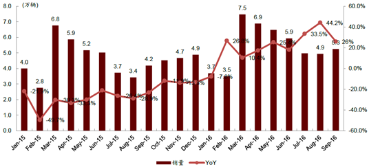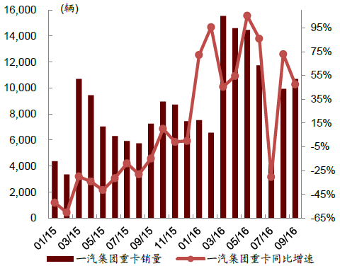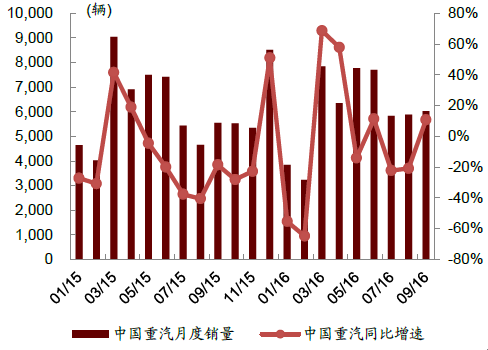 核心提示:自今年2 月以來,重卡已經連續8 個月同比正增長,其中8月增速更是創下今年以來新高,同比增長達到44.2%。2016 年1-9 月累計銷量達到49萬輛,同比增長20%,重卡的全面復蘇已無疑問。2015-2016年中國重卡月度銷量 重卡銷自今年2 月以來,重卡已經連續8 個月同比正增長,其中8月增速更是創下今年以來新高,同比增長達到44.2%。2016 年1-9 月累計銷量達到49萬輛,同比增長20%,重卡的全面復蘇已無疑問。