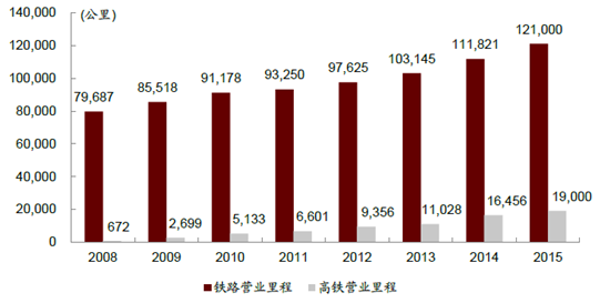 2008-2015年鐵路與高鐵運營里程數