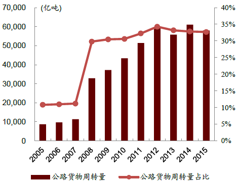 2005-2015年公路貨物周轉量及占比
