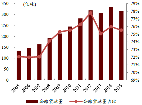 2005-2015年中國公路貨運量及占比