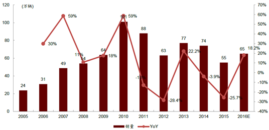2005-2016年中國重卡年度銷量