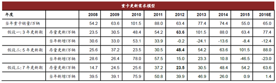考慮到目前治理超載剛剛執行,終端的重卡用戶存在部分觀望情緒,重卡是典型的生產資料,預計明年3 月旺季有望迎來更新高峰期,更新的需求有望延續到明年年中甚至年底,如果這部分更換節制按照2016/17/18 年更換為5/10/5 萬輛的節奏進行,預計明年