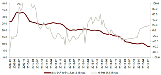 固定資產完成額累計同比(左)與重卡(右)累計同比走勢