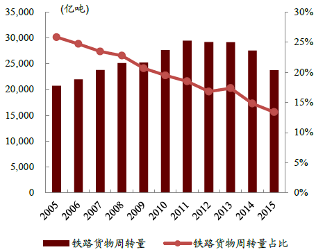 2005-2015年鐵路貨物周轉量及占比