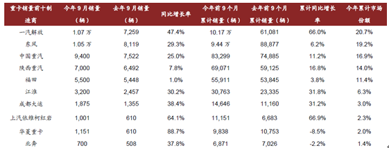 分企業來看,上汽依維柯紅巖、一汽解放、江淮、大運和陜西重汽等增速較快;尤其是一汽解放今年前9 個月以累計66%的增速躍居行業總銷量榜首,上汽依維柯紅巖以67%的累計同比增長位列增速第一;而陜西重汽增速穩步提升,中國重汽也從7 月開始發力。