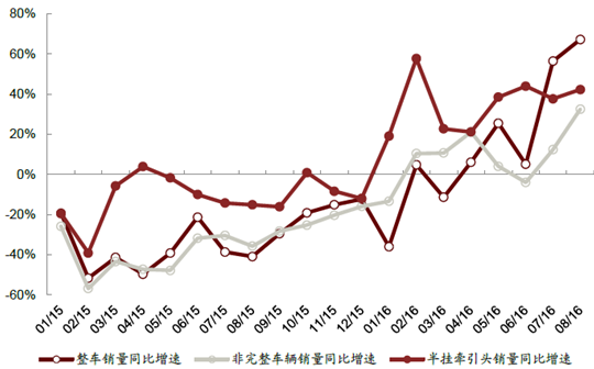 重卡三類車型銷量均于16 年開始呈現整體向上趨勢,同比正增速已站穩,尤其是半掛牽引車和整車,8 月同比增速分別達到了42%和67%。其中整車與非完整車輛增長恢復前期弱于半掛牽引車,但近3 個月也開始明顯回升,后續如基建繼續加碼,仍有向上空間。半掛牽引車今年以來一直保持著好于其它兩類重卡的增速,近幾個月一直保持著30%以上的增速。