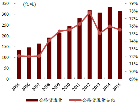 2005-2015年中國公路貨運(yùn)量及占比