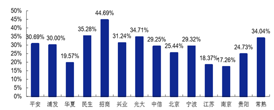 2016 年上半年,招商銀行零售業(yè)務(wù) 營(yíng)業(yè)收入占比達(dá)到 47.11%,利潤(rùn)貢獻(xiàn)更是達(dá)到 60.26%,充分體現(xiàn)了零售業(yè)務(wù)對(duì)其的重要性。 平安、民生、光大和中信等股份行零售業(yè)務(wù)收入占比均超過 25%,但利潤(rùn)貢獻(xiàn)仍偏低,表明 其零售業(yè)務(wù)的經(jīng)營(yíng)效率仍需提升。寧波銀行和常熟農(nóng)商行零售業(yè)務(wù)利潤(rùn)占比也突破 30%,在 零售業(yè)務(wù)發(fā)展上較其他城商行和農(nóng)商行更為領(lǐng)先。