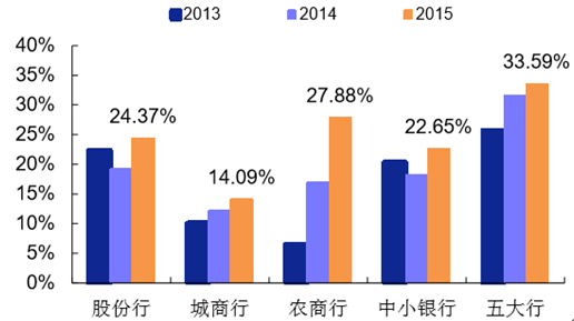 2013-2015 年各類上市銀行個(gè)貸占中小銀行比重