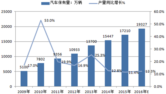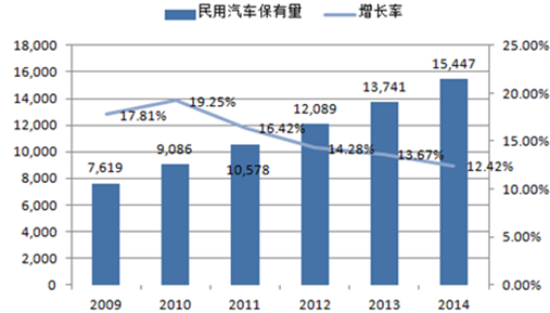 2009-2015年中國汽車保有量及增速