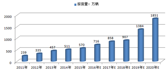 根據近幾年數據,預測到2020年汽車報廢量或能突破2000萬輛,市場規模將達到400-500億元。未來幾年,汽車拆解市場的發展潛力將會逐漸釋放。