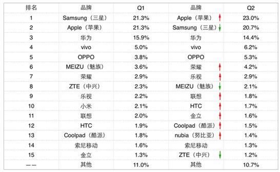 Q2 排行變化方面蘋果重奪榜首的主要原因是9月份新機效應(yīng)已經(jīng)在半年之前開始發(fā)威,iPhone 7新品傳言不斷為蘋果很好的打了一手廣告;華為、vivo、 OPPO憑借廣泛積累的品牌認(rèn)知基本上穩(wěn)定了前五位置。作為第二梯隊的榮耀話語權(quán)逐漸增強,新品V8給市場注入了新鮮血液,引發(fā)更多用戶的關(guān)注;樂視、金 立、nubia等品牌通過不斷新品動作也提振了品牌效應(yīng)。不過魅族雖然在Q2季度連發(fā)三場演唱會,卻并沒有引發(fā)廣泛的關(guān)注效應(yīng),或許是用戶關(guān)注度跑偏到 了。