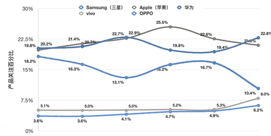 總的來說蘋果、三星、華為持續(xù)獲得中國市場關(guān)注度前三;華為成為首個關(guān)注度比例超過10%的國產(chǎn)品牌,vivo、OPPO引領(lǐng)關(guān)注度第二梯隊。