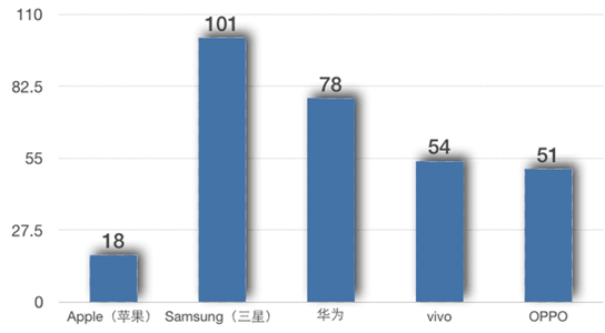 2016年上半年中國手機市場前五品牌在售機型數(shù)量對比