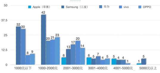 品牌關(guān)注度前五分別是蘋果、三星、華為、vivo、OPPO,我們分別從關(guān)注度比例、在售機型數(shù)量以及各價位段手機數(shù)量分布來觀察,份額上來看前五名已經(jīng)吸 引了市場68.5%的注意力,超過半數(shù)的手機希望在這幾個品牌中購買手機。價位段方面產(chǎn)品也主要集中要1000-3000元區(qū)間,從而可以觀察出用戶購買 手機的軌跡,華為、vivo、OPPO旗艦機多集中在這一區(qū)間,同時三星中端手機也當(dāng)仁不讓,從接下來的單品關(guān)注度上也印證了這一事實。