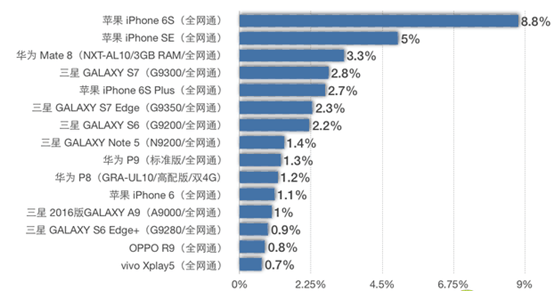 前面提到用戶品牌關(guān)注度正在集中在前幾名,現(xiàn)在用戶對單品的關(guān)注度同樣印證了這一趨勢,前十名關(guān)注的單品來自于品牌關(guān)注度前五。蘋果上榜機型 iPhone 6S、iPhone 6S Plus已經(jīng)上市8個多月,仍然強勢占領(lǐng)強五,令人意外一年多前發(fā)布的iPhone 6也位居前十,充分印證了 品牌的力量,另外4英寸的iPhone SE雖然普遍不被市場看好,仍然獲得超高人氣。華為三款上榜機型中Mate 8關(guān)注度最高,超過了三星 Galaxy S7排名關(guān)注度第三名,這款商務(wù)續(xù)航大屏手機滿足了大部分國人對旗艦機的設(shè)想,隨后發(fā)布的P9憑借徠卡雙攝將國產(chǎn)手機拍照推向頂峰,發(fā)布一 年多的P8也榜上有名,P系列的高端人氣已經(jīng)無人可擋。三星方面分別由Galaxy S7、S7 Edge以及S6、A9、S6 Edge+五款手機上 榜,均勻分布中高端系列中,尤其是S系列打造出的雙曲面屏已經(jīng)獲得用戶的高度認(rèn)可,幫助三星開啟再次上升的大門。OPPO R9和vivo Xplay5 分別主打超薄拍照和曲面性能旗艦,憑借差異化的產(chǎn)品規(guī)格在線下市場獲得極高銷量。
