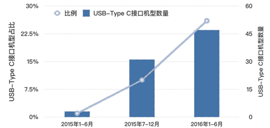 2015年1月-2016年6月上市手機機型當中USB-TYpeC接口機型數量及占比