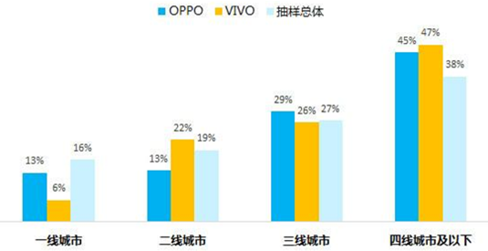 安卓品牌OPPO、VIVO各線城市使用占比分析