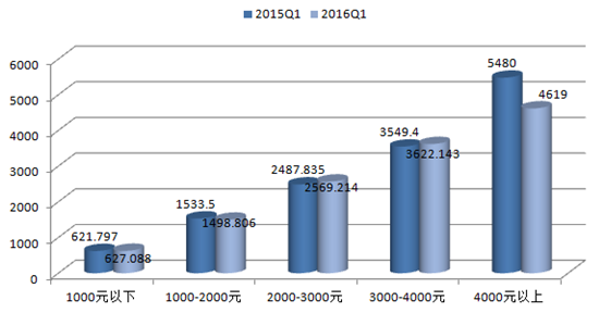 那么究竟是千元機價格提升還是越來越多的國產手機試探3000元以上市場造成的均價提升,我們分別將手機價格按照1000元以下、1000-2000元、2000-3000元、3000-4000元、4000元以上五個價位段進行分析。