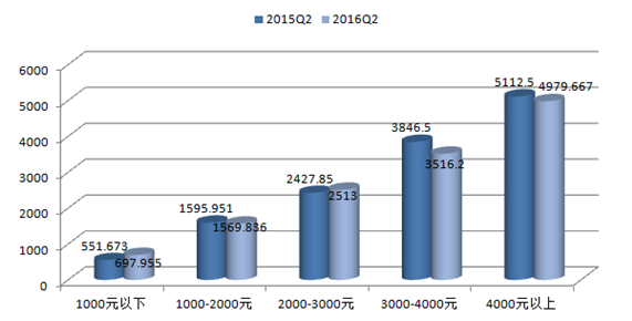 2016 年上半年,國產手機中高端手機集體嘗試突破產品溢價,尤其是2000元-3000元、3000元以上市場產品數量增多,那么真實的趨勢是什么?國產手機單 價是否出現上揚?我們分別統計了2015年上半年317款手機和2016年上半年238款手機的單價,并按照季度來窺探手機價格趨勢。