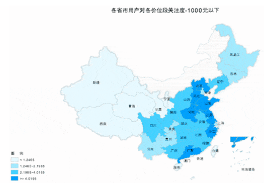 用戶關注度方面,各省市對各價位段的關注度各不相同,不過都主要集中在北京、廣州、浙江等沿海地區,從東部到西部關注度依次下降。