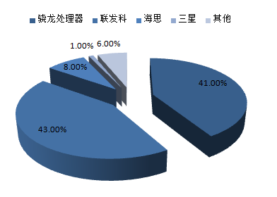 時間來到2016年手機處理器供應商仍是高通和聯發科兩家獨大,海思憑借華為內部強大的消化能力也逐漸在處理器市場崛起。在238款智能手機中共有98款驍 龍處理器設備和103款MTK處理器設備,分別占據總量的41%和43%,體量上兩家不分伯仲,總和已經達到84%的市場占有率。