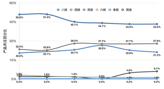 2016年1-6月中國手機市場不同核 心數產品關注比例走勢