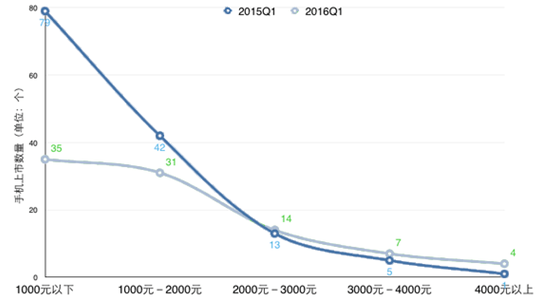 2016年上半年新機上市238款,比往年同期有33%的下降;1000元以下手機數量普遍減少,1000-2000元、2000-3000元手機發布數量增多。