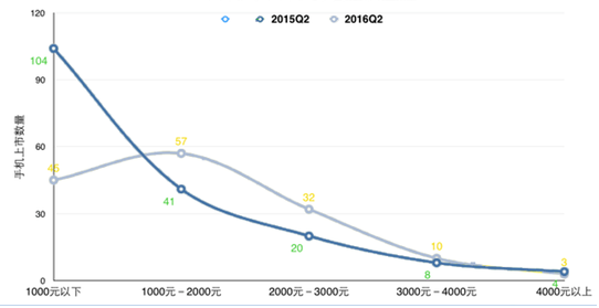 2016 年Q2手機發布數量出現爆發,其中1000元以下手機產品上市量跌半,但從1000元-2000元開始,手機上市量超越往年,其中1000-2000元手 機數量比往年同期增長16款,2000元-3000元手機數量環比增長12款,手機發布數量整體往高價位增長。