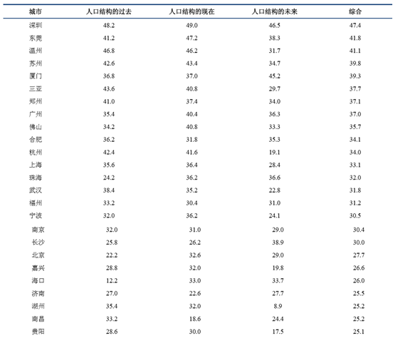 對全國 50 大城市進行了排序,從人口年齡結構的競爭力來比較,深圳、東莞、溫 州、蘇州、廈門、三亞、鄭州、廣州、佛山、合肥、杭州、上海、珠海、武漢、福州、寧波、南京、長沙、北 京等城市具備更強的優勢。而吉林、齊齊哈爾、宜昌、大同、重慶、沈陽、西安等二三線城市人口年齡結構與 以上城市存在非常明顯的差距。