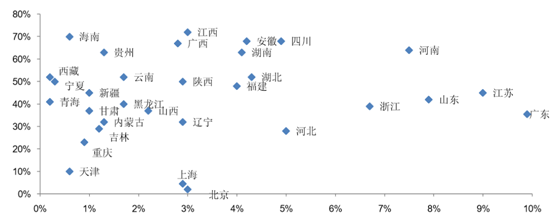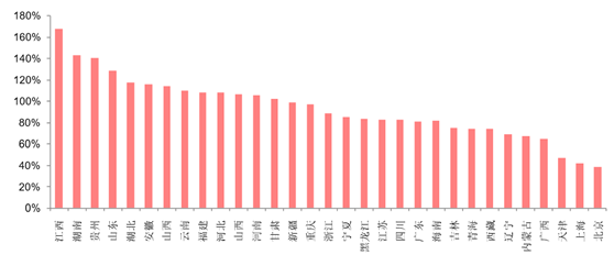 從省市口徑的年齡結構來看,比較 2014 年全國各大省市的撫養比數據,其中撫養比最高的十大省市 分別為廣西、貴州、四川、西藏、江西、河南、重慶、湖南、安徽和新疆,高撫養比的省市大多集中在中西部 區域,而撫養比最低的十大省市分別為北京、上海、黑龍江、浙江、吉林、遼寧、天津、內蒙古、山西、廣東, 東部省市的年齡結構顯著更為優化。