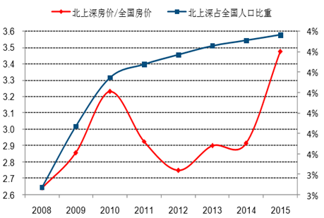 從英國、美國等經驗來看,隨著國家城市化率提升,人口進一步向收入高、公共配套好的核心城市集中, 使得核心城市和非核心城市的房價級差逐步拉大,如舊金山,而當核心城市的人口吸附力下降時,其與非核心 城市的房價級差又會開始縮小,典型城市如韓國首爾。從我國的一線城市經驗來看,北上深占全國人口比重逐 步上升,一線城市房價和全國均價的級差也將進一步擴大。