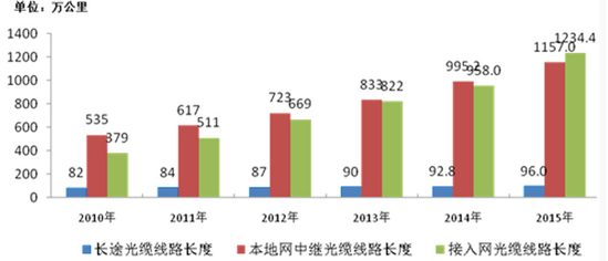 2015年,全國新建光纜線路441.3萬公里,光纜線路總長度達到2487.3萬公里,同比增長21.6%,比上年同期提高4.4個百分點。