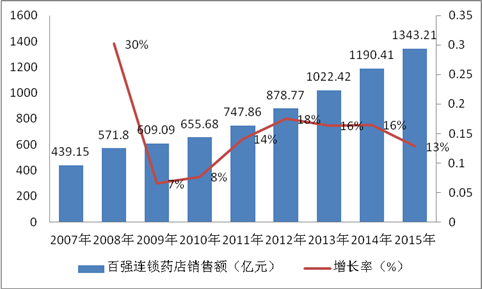 2007-2015我國百強(qiáng)連鎖藥店銷售額
