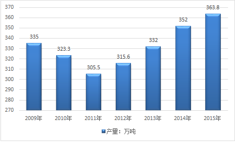 2009-2015年中國中藥材產量走勢圖