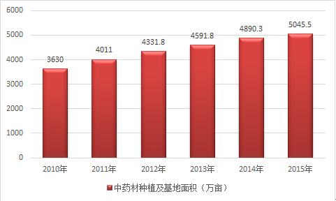 中經先略數據中心發布的《2016-2022年中國中草藥化妝品產業發展現狀分析及市場評估咨詢報告》顯示,我國中藥材種植主要分布在湖南、貴州、甘肅、陜西、遼寧、廣東等幾個省市。2015年我國中藥材種植面積約5045.5萬畝,近幾年我國中藥材種植面積情況如下圖所示: