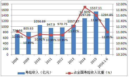 從整體來看,2015年,廣東省實現壽險收入1537.11億元,壽險保費收入居于全國首位,占全國壽險保費收入的比重為11.61%,占全省保險收入的比重為54.62%。