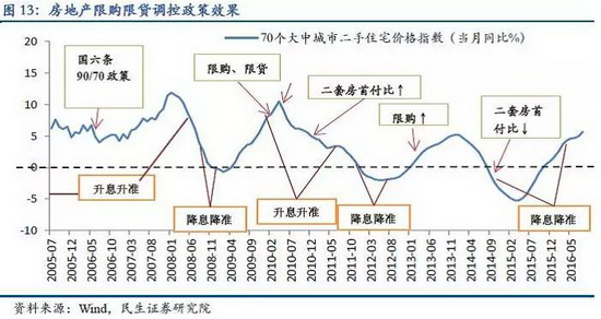 但需要注意的是,貨幣緊縮并不能對(duì)抑制房?jī)r(jià)過快上漲起到?jīng)Q定性的作用。如果房地產(chǎn)需求旺盛,貨幣緊縮也難以改變上漲趨勢(shì),但如果房地產(chǎn)需求低迷,貨幣緊縮會(huì)對(duì)房?jī)r(jià)下滑起到助推作用。比如在2005年至2007年經(jīng)濟(jì)過熱時(shí)長(zhǎng)時(shí)間的升息升準(zhǔn)并沒有抑制房?jī)r(jià)上漲,但在上一輪房?jī)r(jià)調(diào)控中,貨幣緊縮對(duì)部分一二線城市的效果十分明顯,在限購(gòu)出臺(tái)之前,房?jī)r(jià)就在貨幣政策的影響下進(jìn)入下行通道,2013年-2014年間的貨幣穩(wěn)健(無大規(guī)模刺激政策)也抑制了部分城市的購(gòu)房需求。之所以效果差別很大的原因在于2005年-2007年間加息是抑制經(jīng)濟(jì)過熱,而2011年的調(diào)控在金融危機(jī)之后,內(nèi)外需低迷,貨幣緊縮是為了抑制由危機(jī)后寬松導(dǎo)致的通脹,而不是調(diào)節(jié)實(shí)體經(jīng)濟(jì)需求,此時(shí)貨幣緊縮對(duì)房地產(chǎn)企業(yè)的打擊較大,部分房企出現(xiàn)資金鏈斷裂的風(fēng)險(xiǎn),均主動(dòng)下調(diào)新房?jī)r(jià)格,整體房?jī)r(jià)也隨之下跌。