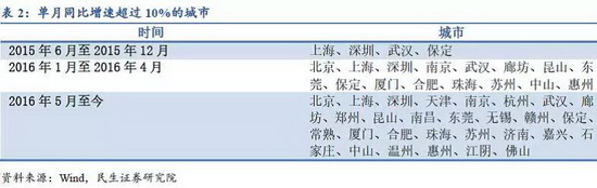 在2016年1月至2016年4月之間,同比增速超過10%的城市又添加了北京、南京、合肥、廊坊、昆山、東莞、廈門、中山、惠州、珠海等多個(gè)城市,此輪更多出現(xiàn)的是地縣級(jí)市和經(jīng)濟(jì)特區(qū)。在4月北京、上海、深圳限購(gòu)升級(jí)后,5月至今房?jī)r(jià)大幅上漲的城市擴(kuò)展到更多的二三線城市,省會(huì)城市也開始增加,如杭州、濟(jì)南、石家莊、南昌等。