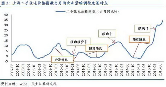 2015年5月,上海房?jī)r(jià)同比增速由負(fù)轉(zhuǎn)正,隨后房?jī)r(jià)持續(xù)上漲,2016年3月,上海市大幅收緊限購(gòu)限貸政策,但是幾乎沒有效果,上海市房?jī)r(jià)增速持續(xù)上升,8月當(dāng)月同比34.4%。