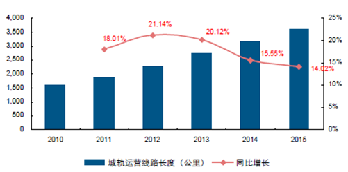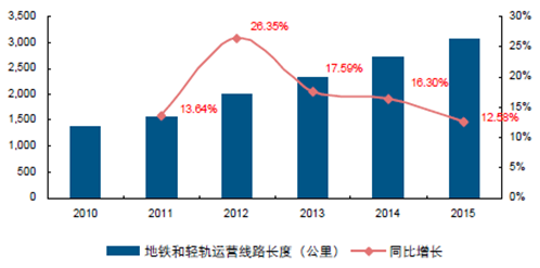 據交通部數據,2015 年地鐵和輕軌運營長度同比增長12.58%