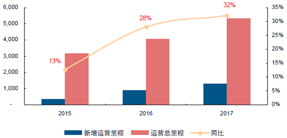 2015-2017 年地鐵和輕軌運營里程復合增速達30%