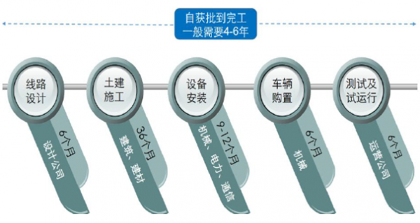 就軌道交通項目整體而言,其成本結構一般較為穩(wěn)定:土建工程(含車輛段)占55%, 機電設備(含信號系統)占20%,車輛及零部件占10%,其他費用占15%。不同軌交制式的成本占比差異不大,但從每公里造價來看,高鐵和城際約為1.5-2.5 億元,城軌(地鐵和輕軌)約為6-8 億元。時間跨度上來說,完整軌道交通工程自獲批到完工一般需要4-6 年時間,依次經過線路設計、土建施工、設備安裝、車輛購置、測試及試運行等5 大階段。