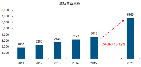 根據十三五規(guī)劃,十三五期間城軌運營里程復合增速達13.12%