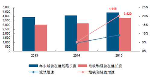 2015 年末,城軌在建線路總長度為4448 公里, 同比增長9.21%