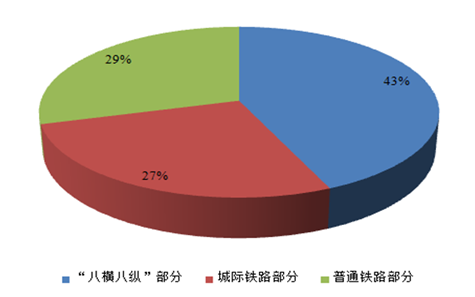 根據(jù)《規(guī)劃》,在“十三五”期間,鐵路新增里程或?qū)⑦_(dá)到 2.8 萬公里。預(yù)計(jì)“十三五”期間鐵路每年新增里程都在 4500 公里以上,分為三大塊,分 別是“八橫八縱”高鐵網(wǎng)路建設(shè)、城際鐵路建設(shè)和普通鐵路建設(shè)。“八橫八縱”每年 新增里程約占總新增里程 1/3 以上,城際鐵路和普通鐵路二者合計(jì)占每年新增里 程的 45%以上。總體來看,“十三五”期間“八橫八縱”預(yù)計(jì)新增里程占比 43%,城 際鐵路預(yù)計(jì)占比 27%,普通鐵路預(yù)計(jì)占比 29%。