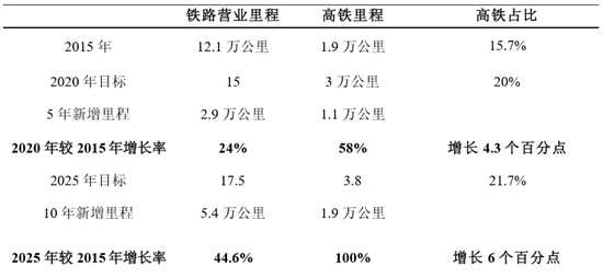 截至 2015 年底,全國鐵路營業(yè)里程為 12.1 萬公里,其中高速鐵路 1.9 萬公里。 為實(shí)現(xiàn) 2020 年的規(guī)劃目標(biāo),未來 5 年鐵路營業(yè)線路將新增 2.9 萬公里,較 2015 年增長 24%;高鐵里程增長 1.1 萬公里,較 2015 年增長 58%。高鐵占比也由 2015 年的 15.7%提高到 2020 年的 20%,增長 4.3 個(gè)百分點(diǎn)。為實(shí)現(xiàn) 2025 年的規(guī)劃目 標(biāo),未來 10 年鐵路營業(yè)線路將新增 5.4 萬公里,較 2015 年增長 44.6%;高鐵里程 增長 1.9 萬公里,較 2015 年增長 100%。高鐵占比也由 2015 年的 15.7%提高到 2020 年的 21.7%,增長 6 個(gè)百分點(diǎn)。