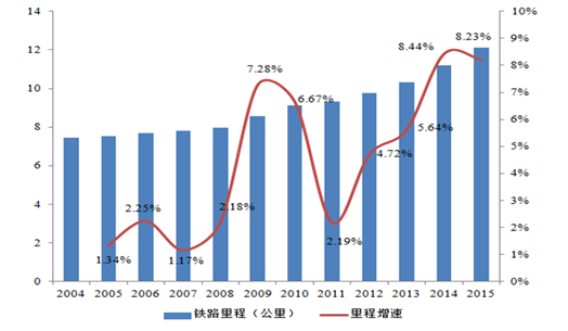 2004-2015 我國鐵路運(yùn)營總里程及增速